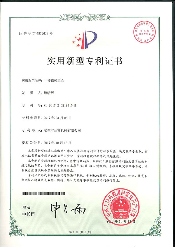 一種鎖模組合專(zhuān)利證書(shū)